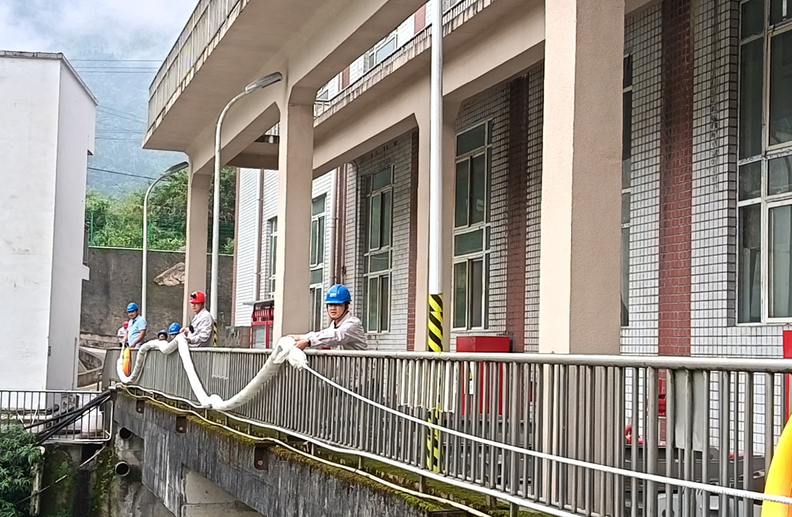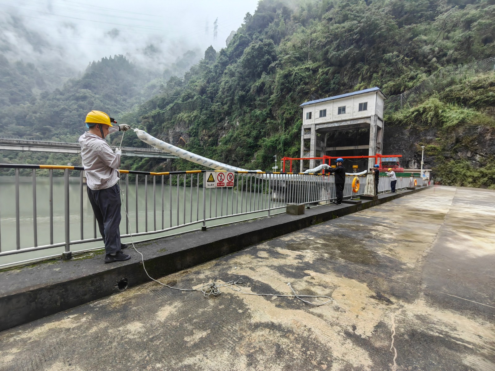 本次演練背景設(shè)定為電站大壩2#泄洪閘左側(cè)齒輪箱突發(fā)漏油,約50升齒輪油濺落至庫(kù)區(qū)水面并擴(kuò)散,值班人員發(fā)現(xiàn)險(xiǎn)情后立即啟動(dòng)應(yīng)急響應(yīng)。中控室迅速協(xié)調(diào)上下游鍋浪蹺、匯溪電廠調(diào)整出力流量并協(xié)助布設(shè)攔油設(shè)施;運(yùn)行組與應(yīng)急搶險(xiǎn)組攜帶吸油氈、攔油索等器材趕赴現(xiàn)場(chǎng),對(duì)漏油點(diǎn)進(jìn)行封堵,同時(shí)在閘門前和水面關(guān)鍵區(qū)域鋪設(shè)攔油繩,防止污染擴(kuò)散;后勤保障組全程待命,確保物資供應(yīng)和人員安全。經(jīng)過30分鐘緊張有序的處置,油污被徹底清理,庫(kù)區(qū)水質(zhì)未受影響,演練圓滿完成。