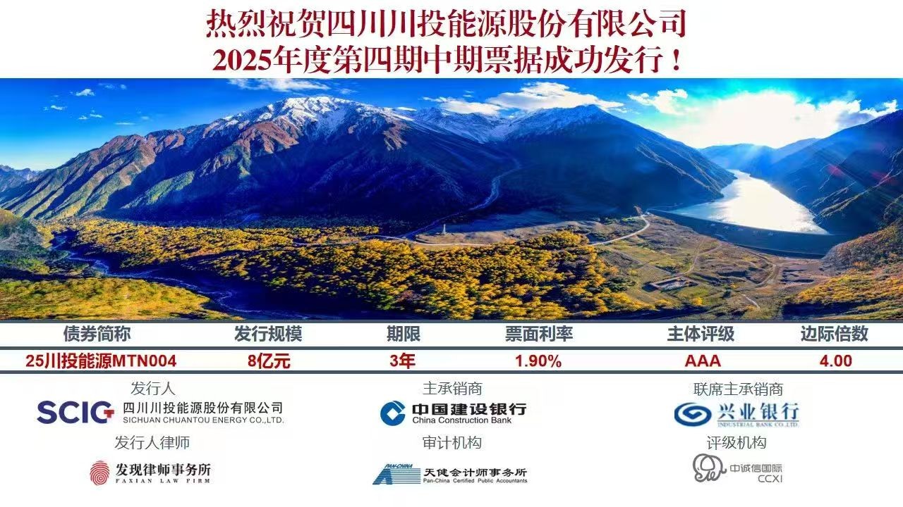 9月19日,川投能源成功發(fā)行2025年度第四期中期票據(jù)。本期中期票據(jù)發(fā)行規(guī)模為8億元,發(fā)行期限3年,發(fā)行利率1.90%,邊際認購倍數(shù)4.00倍,實現(xiàn)全額募集。